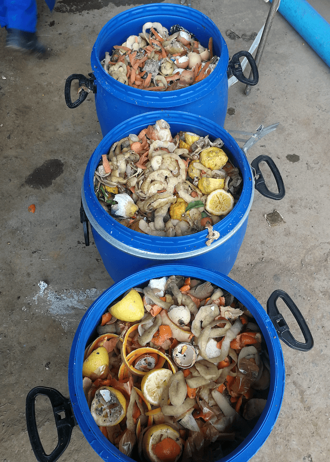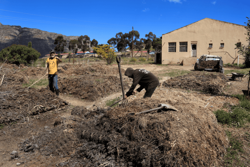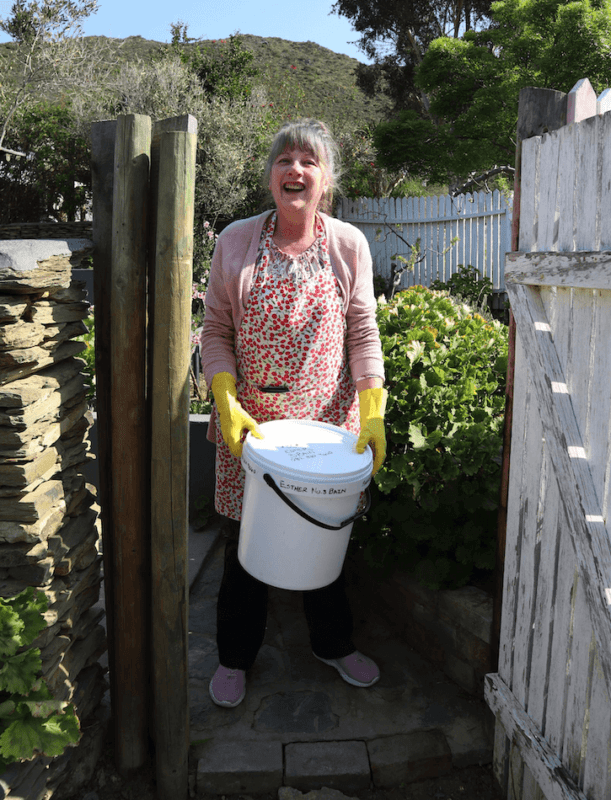 To make good compost there needs to be three main components, wood chippings, cow manure and green kitchen scraps. The wood chippings we get from the municipal chipper that comes to chip the green waist dropped that would otherwise have gone to the dump. We fetch cow manure from Suurbraak the neighboring town and get some manure from farmers with horses and sheep in the village. We have a compost bucket system that fetches 20 L buckets from the hotels, restaurants and private homes in the community every Tuesday.